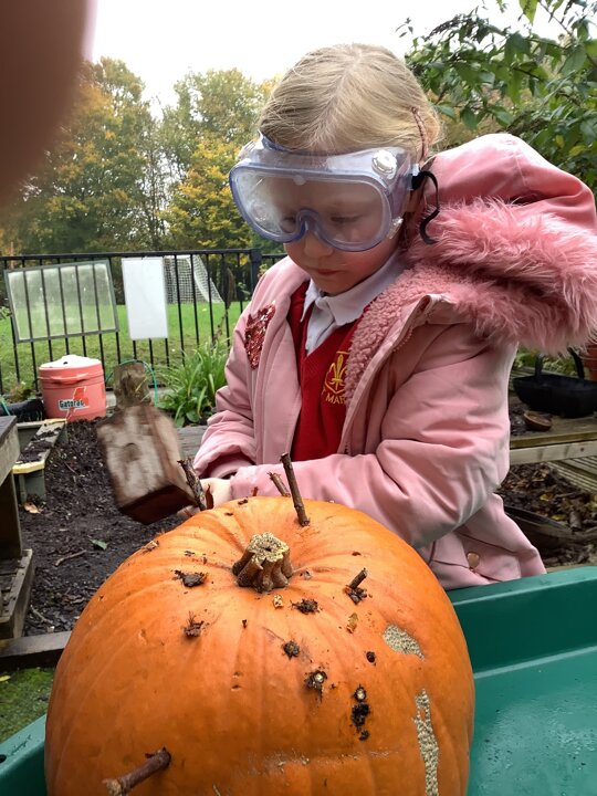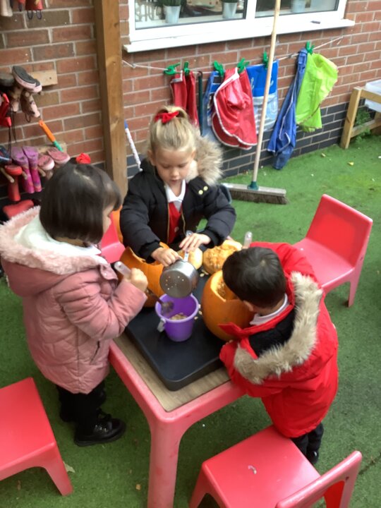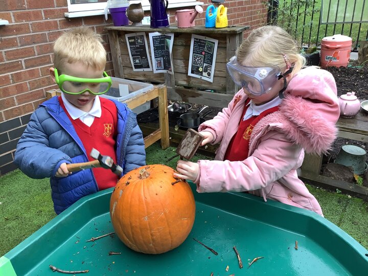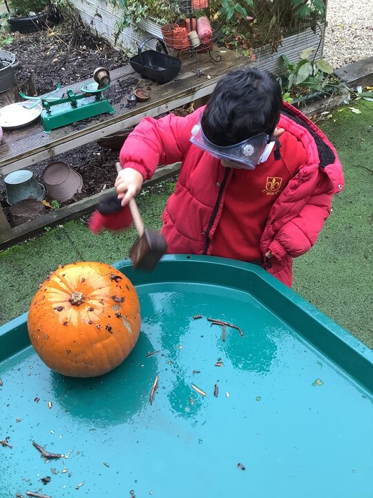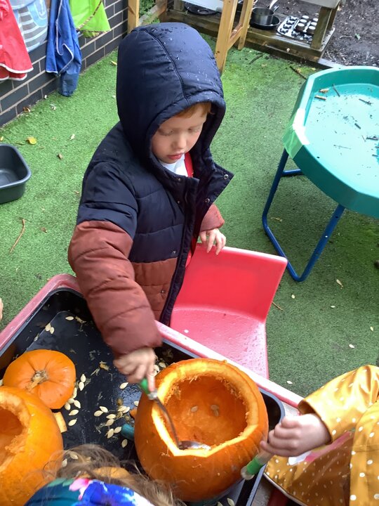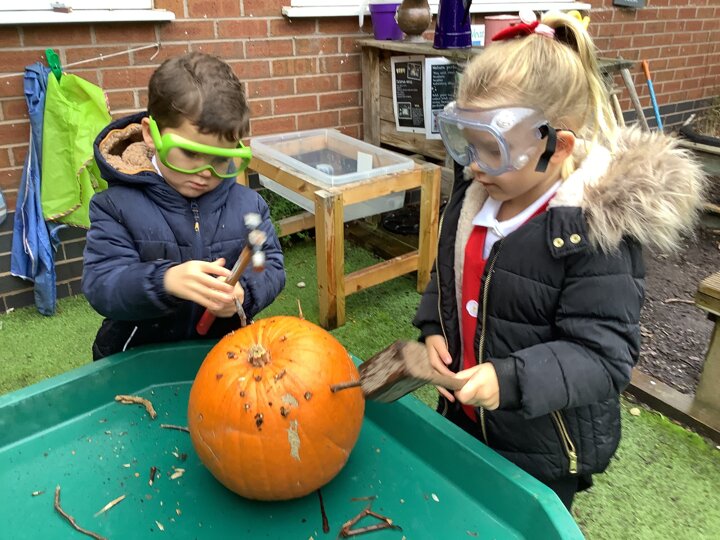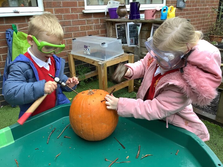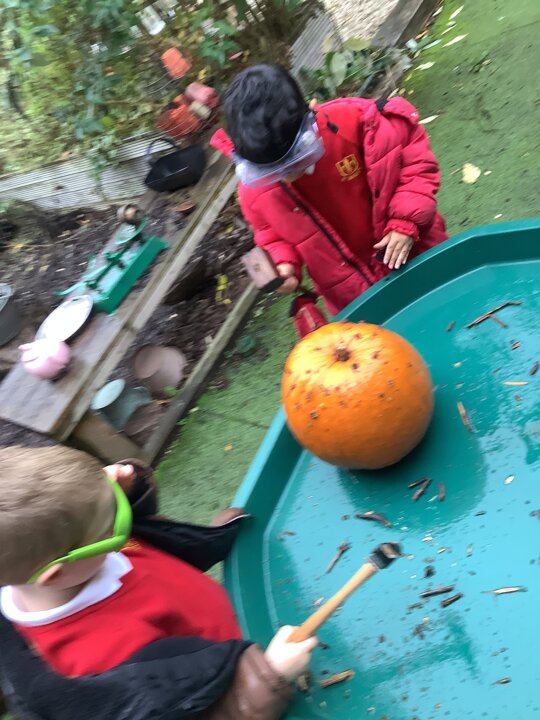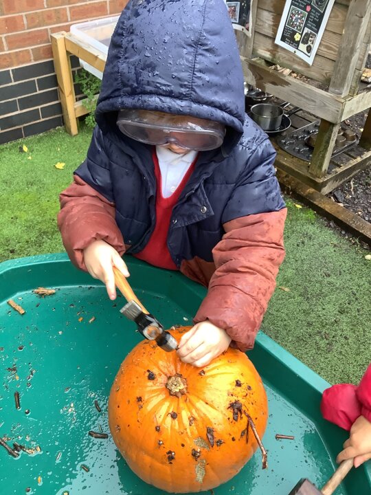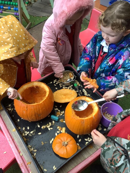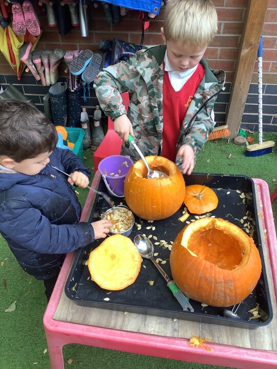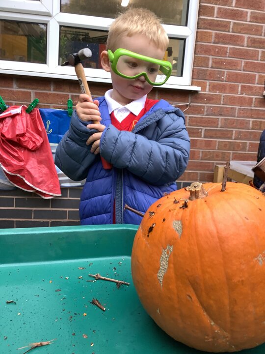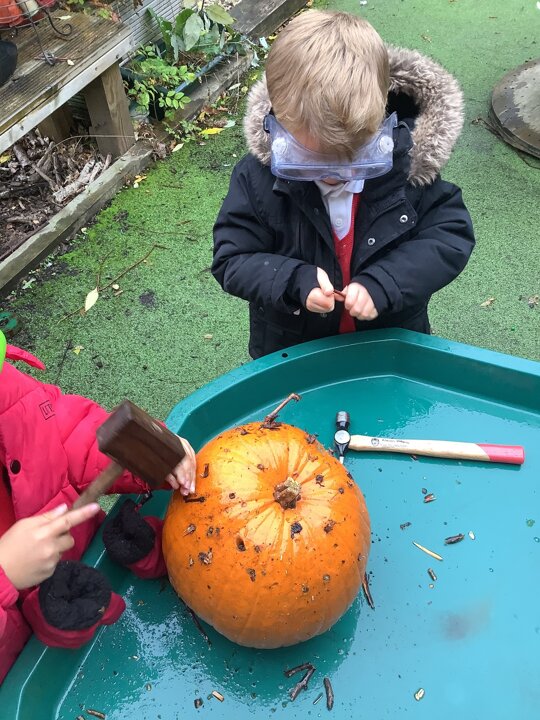 This week we have had lots of messy pumpkin fun. We have scooped out the seeds andused hammers to hammer sticks into the pumpkins. We are hoping to grow our own pumpkins using the seeds we have scooped out of these. We also enjoyed decorating spooky biscuits and painting pumpkins.