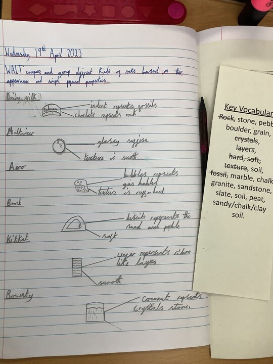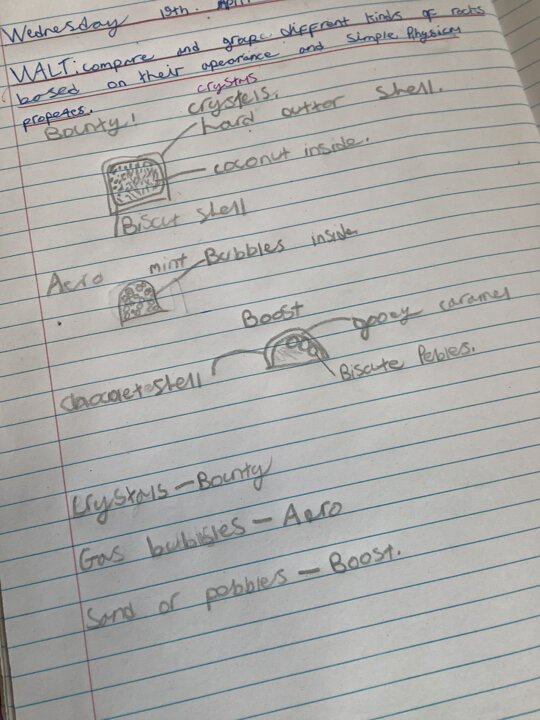 We explored the inside of different chocolate bars to see properties of rocks they reminded us of, and use role play to help us learn about the properties of rocks.