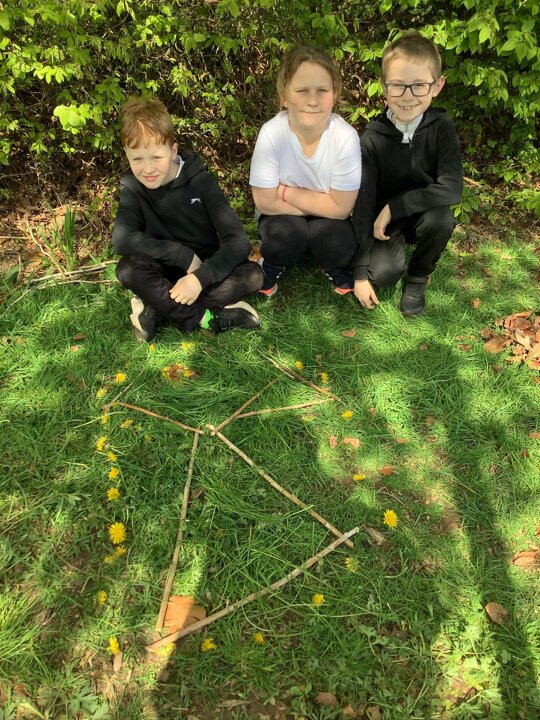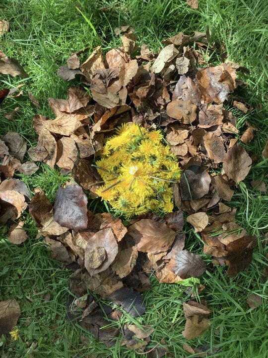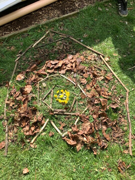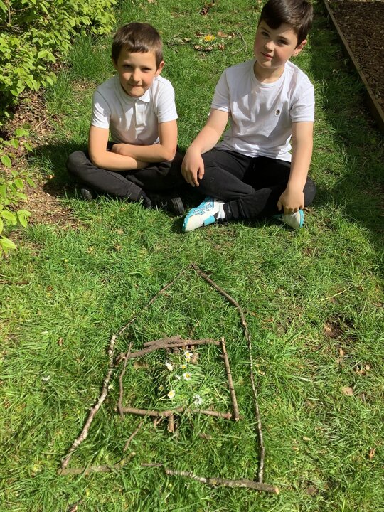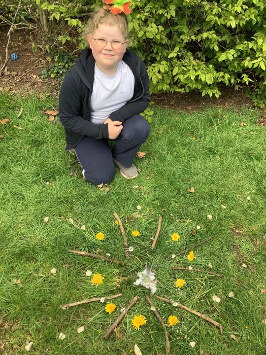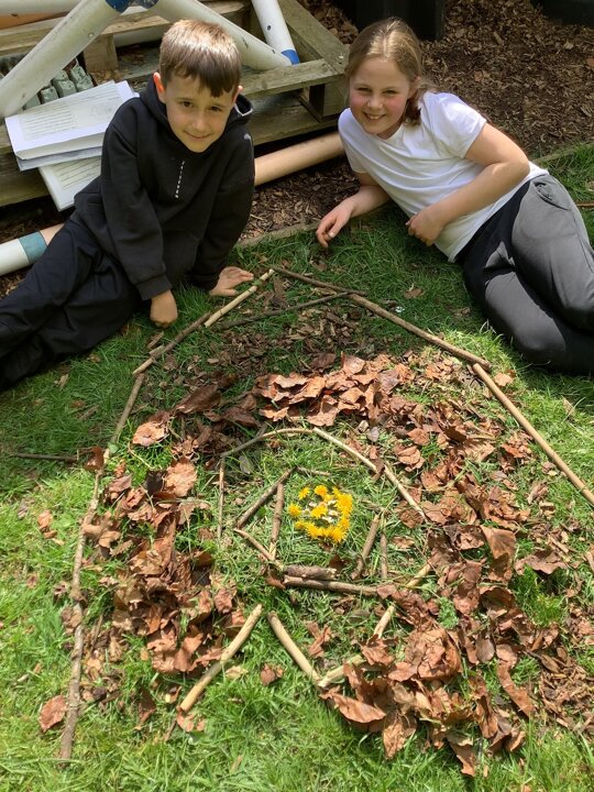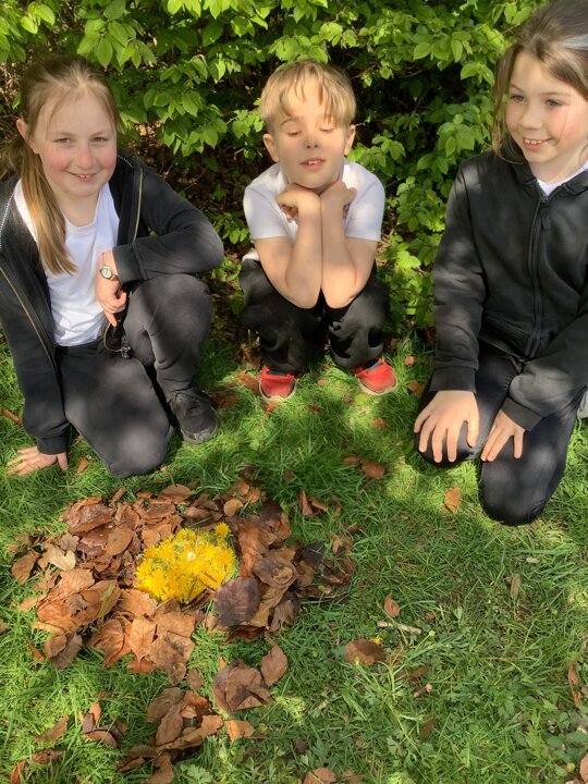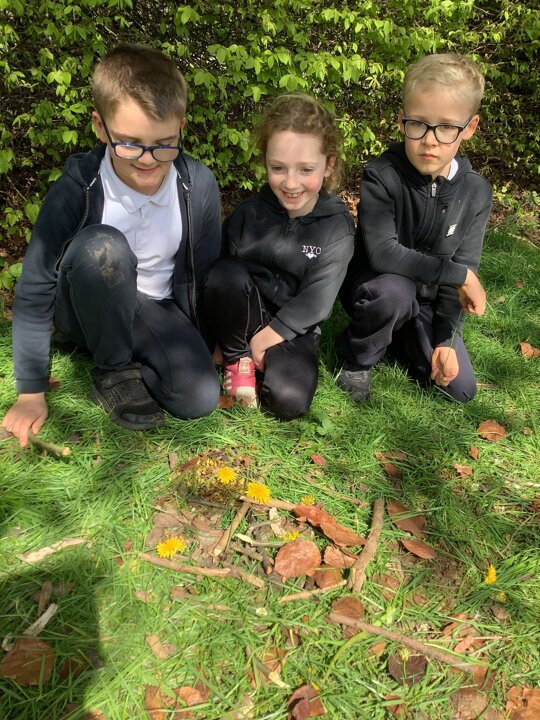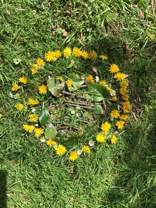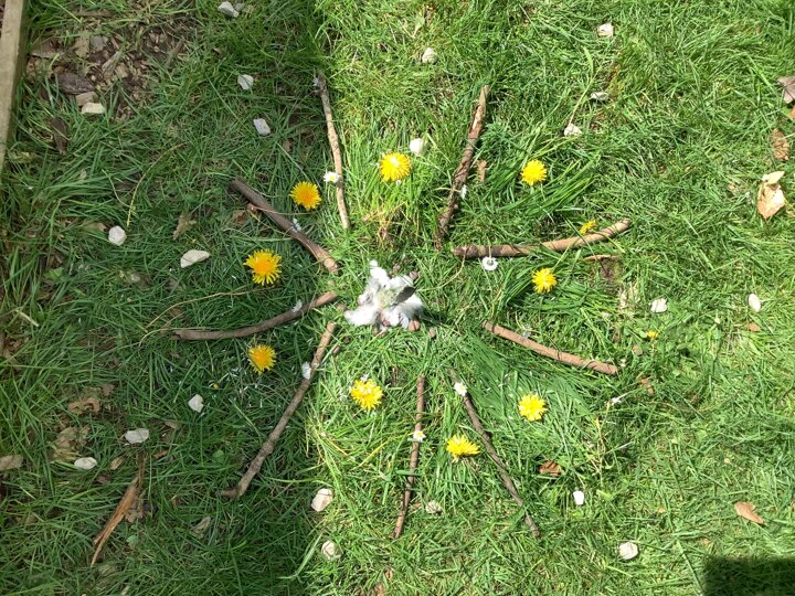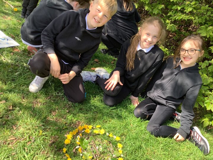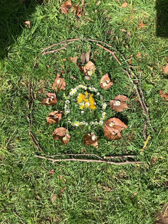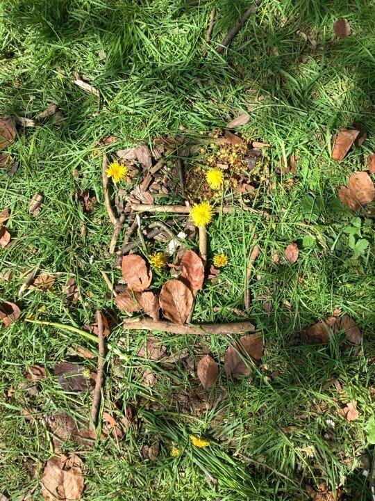 We used materials that were already fallen from plants or lying on the floor, as well as grass, daisies and dandelions to create artwork in groups. We used our plans that we wrote last week and demonstrated some fantastic teamwork and creativity.