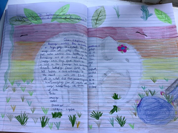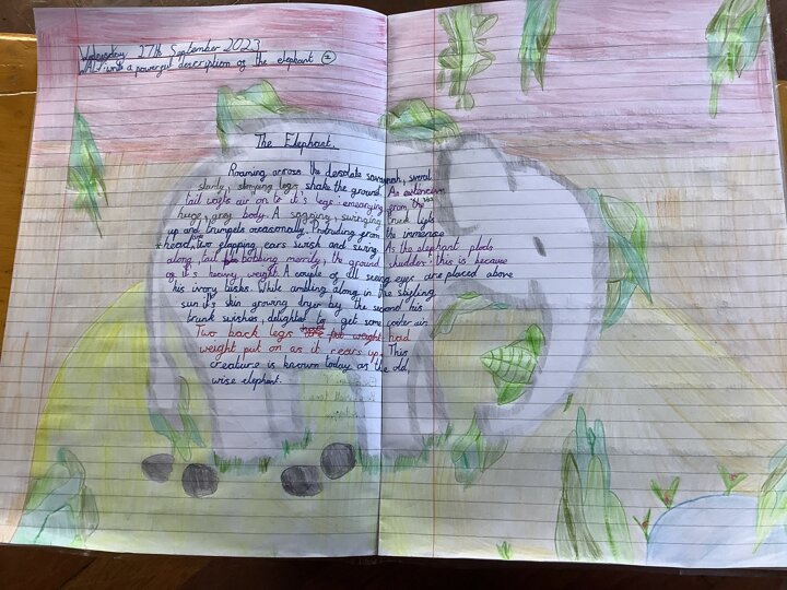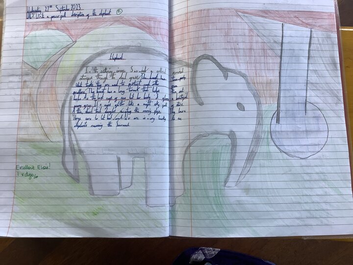 In English we have been working on our descriptive writing. We have tried hard to try to include a noun phrase, adverbial phrase and colon sentence.We think they are brilliant!,,