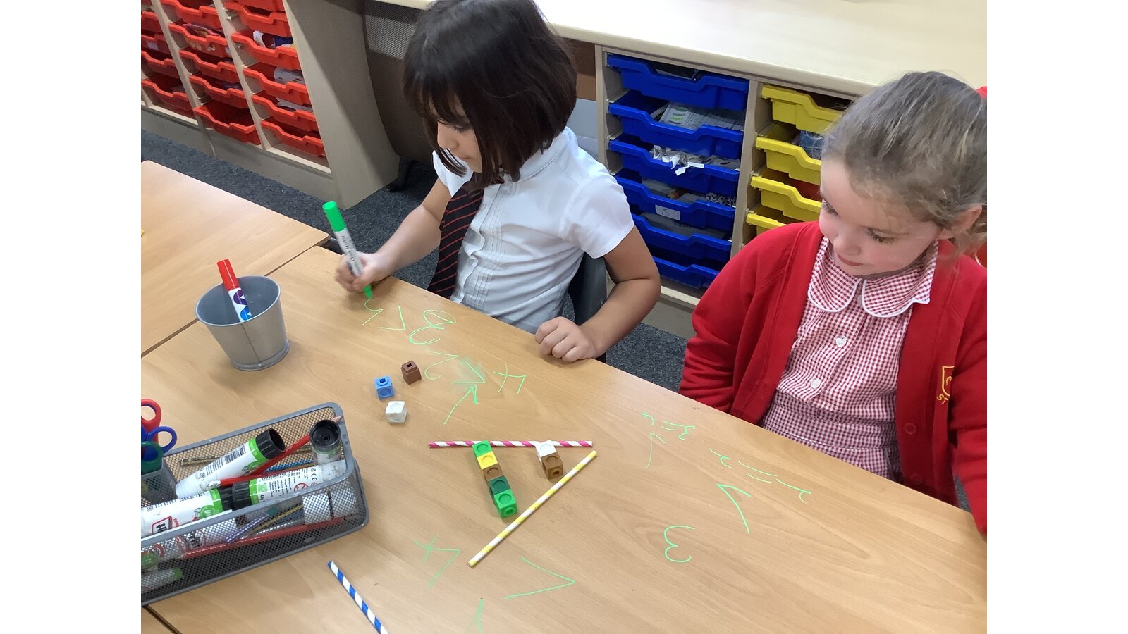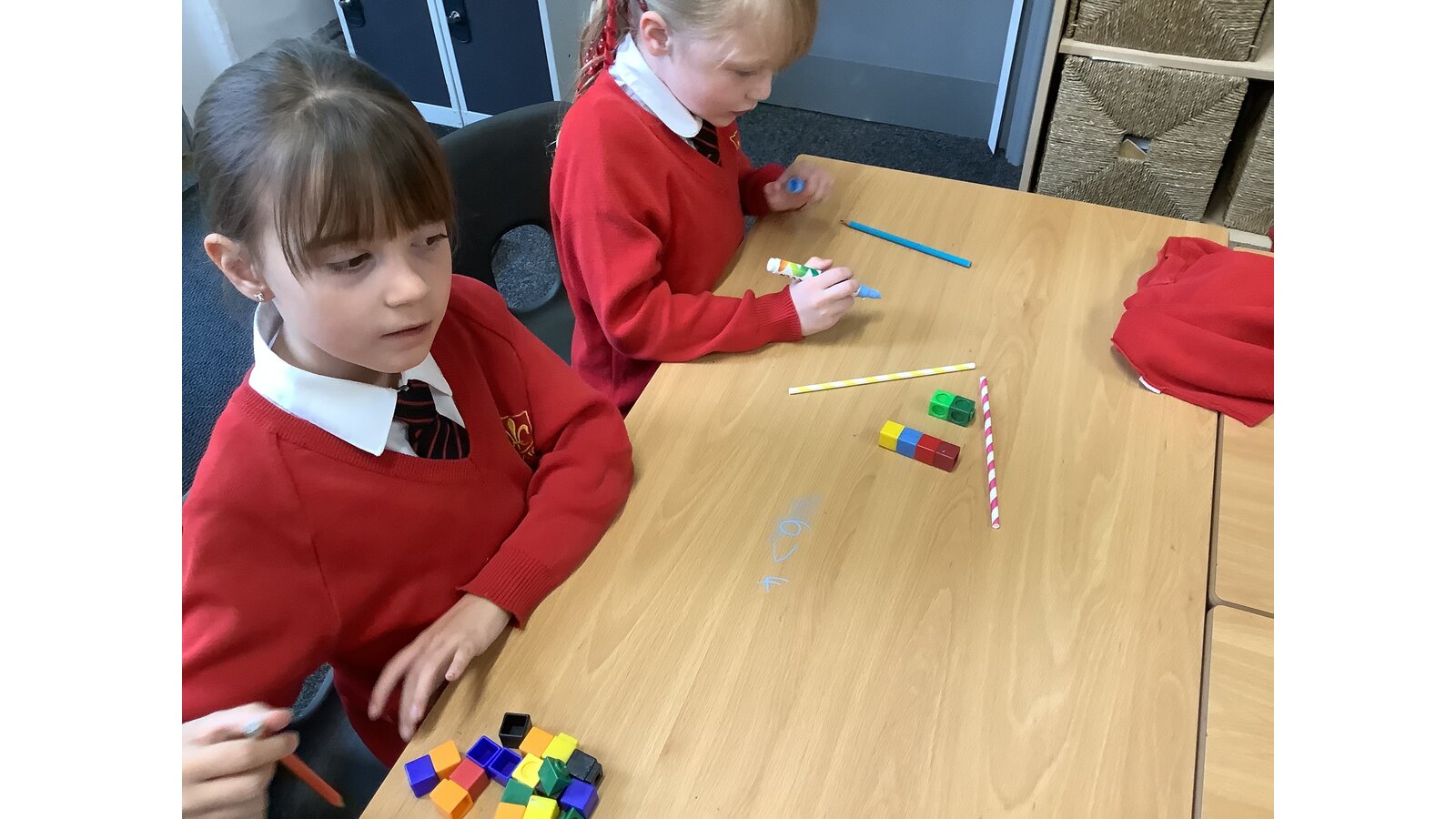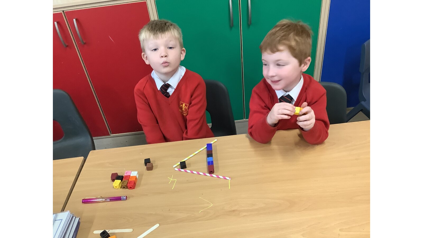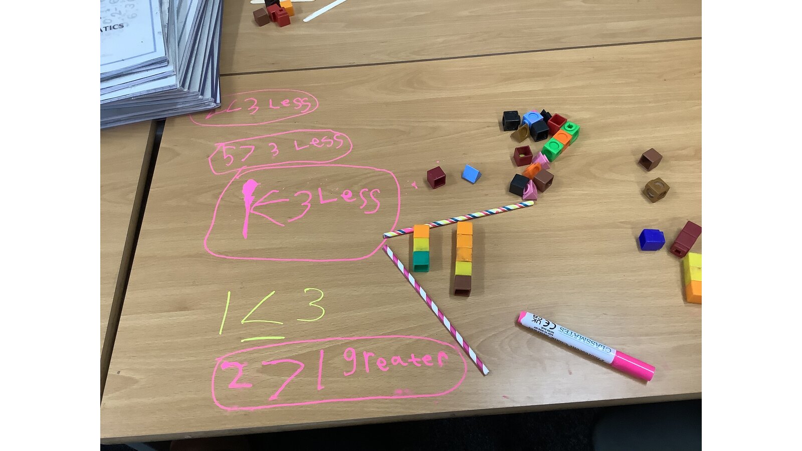 Today in maths the children have been exploring greater than, less than and equal to. We used the straws and cubes to represent this the symbols and quantities within 10.