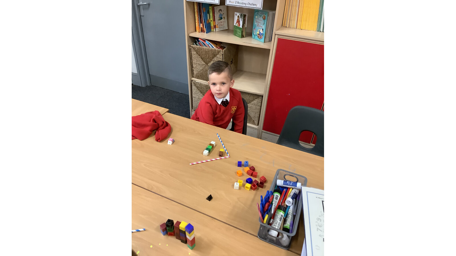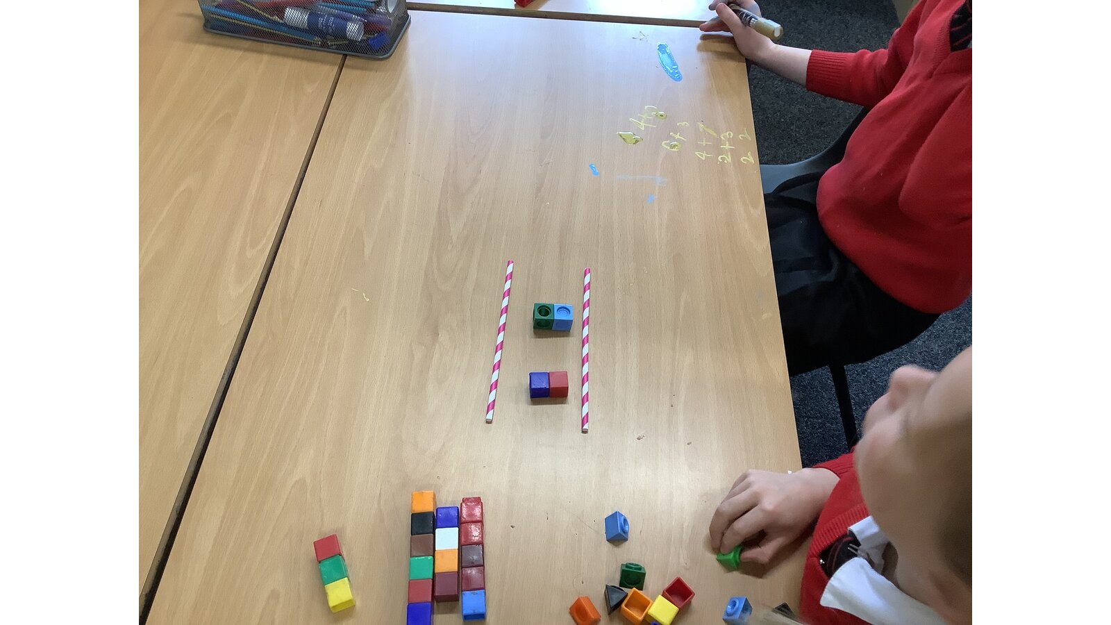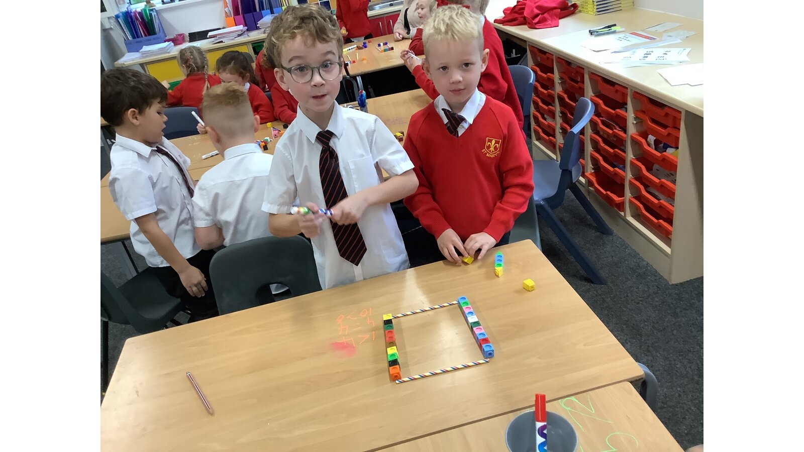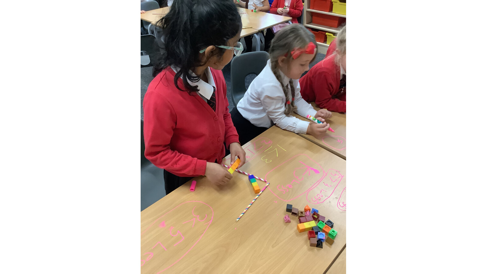 Today in maths the children have been exploring greater than, less than and equal to. We used the straws and cubes to represent this the symbols and quantities within 10.