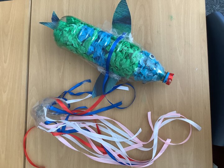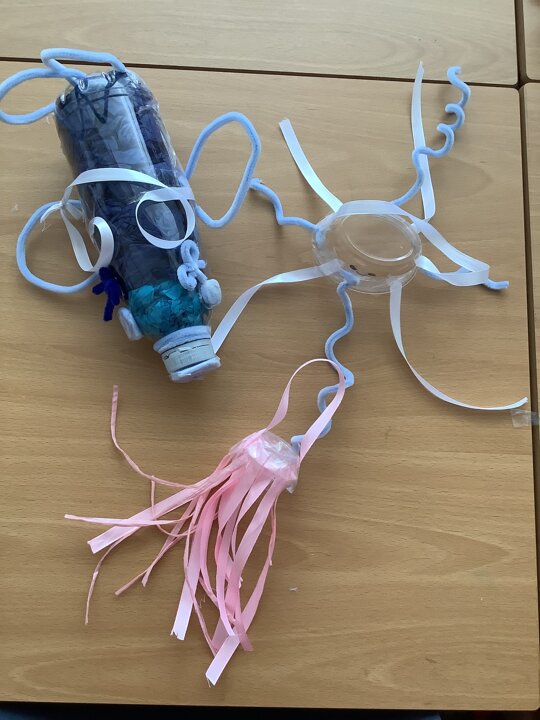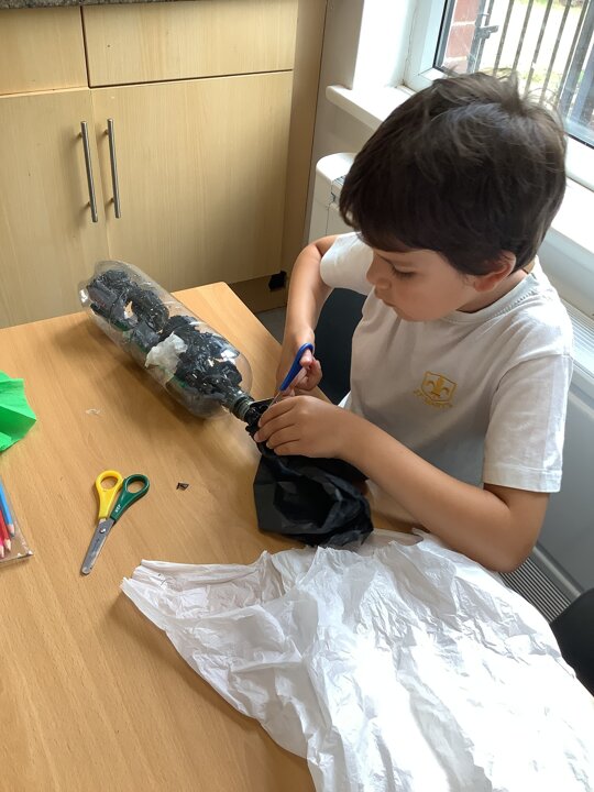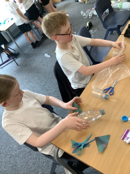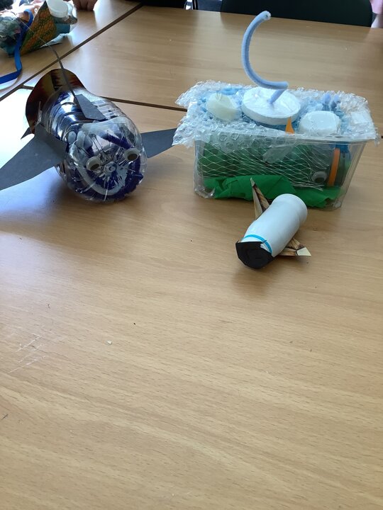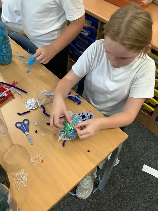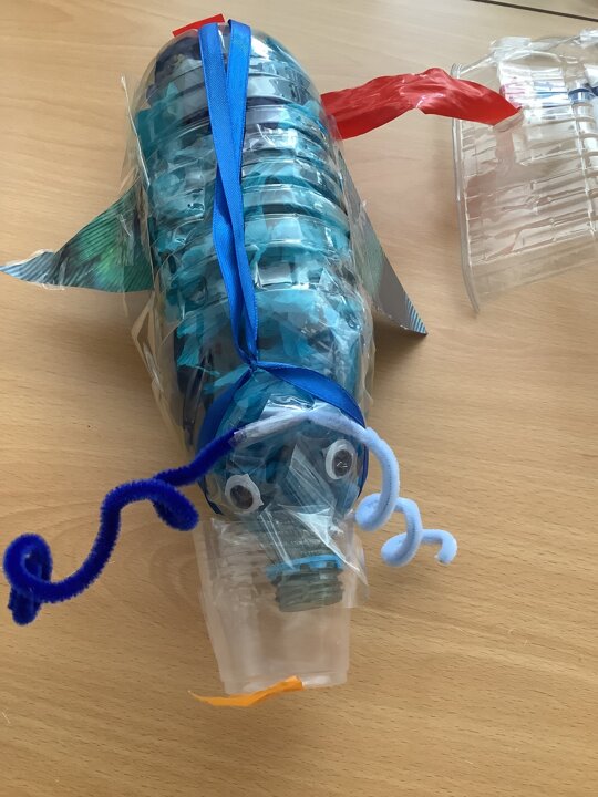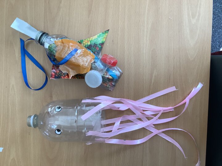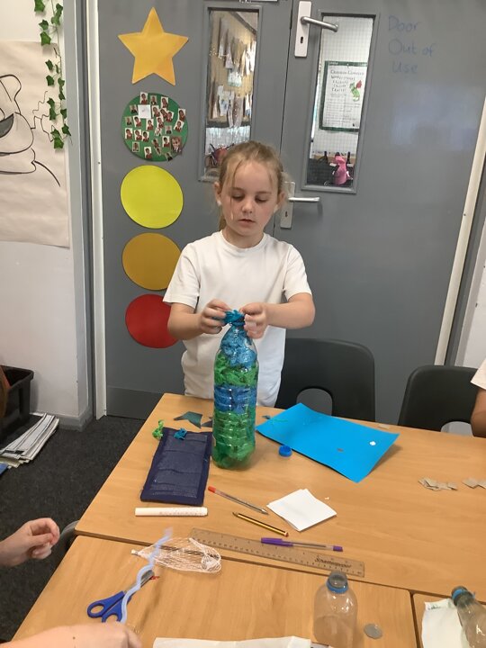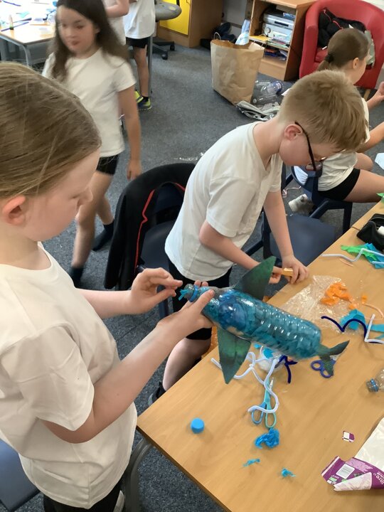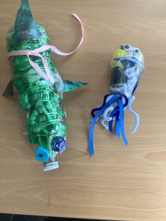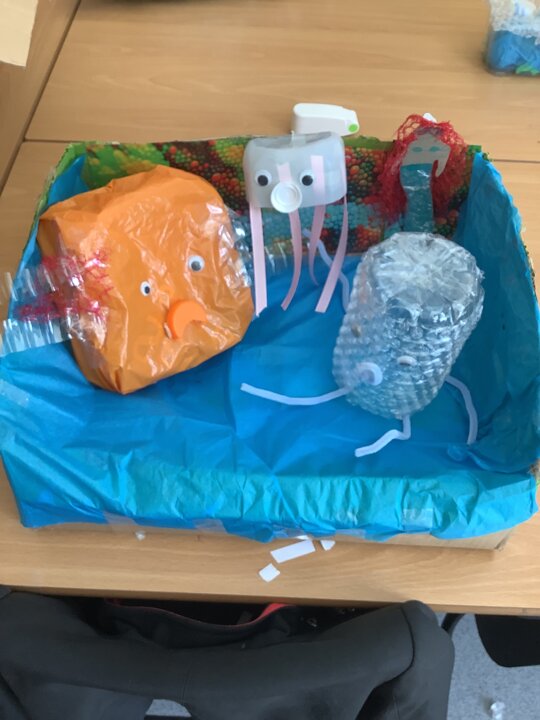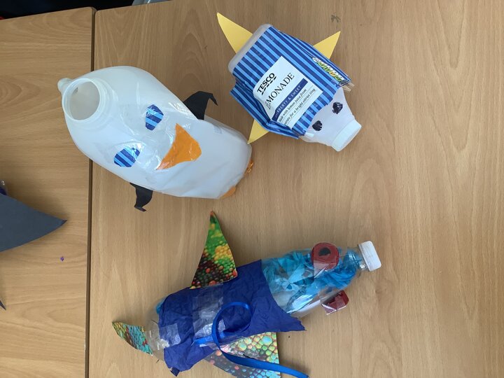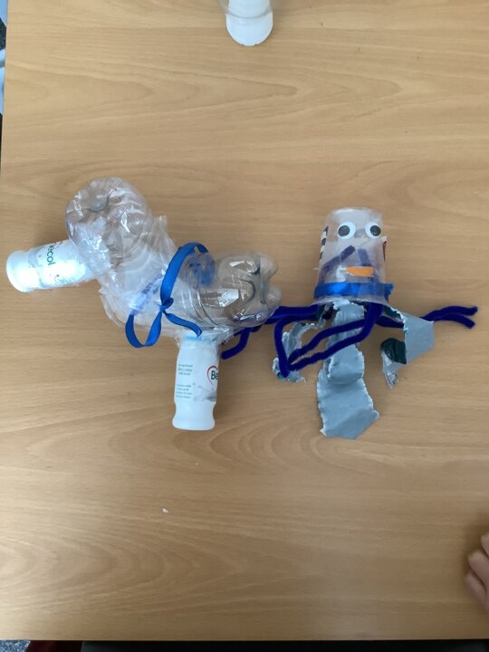 In art, we have been learning about sculpture. We learnt about two environmentalist artists called Judith and Richard Lang who create sculptures from plastic they find on a beach in California. We used as many recycled materials as possible to create our sculptures inspired by Judith and Richard Lang’s art.