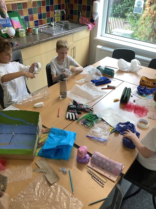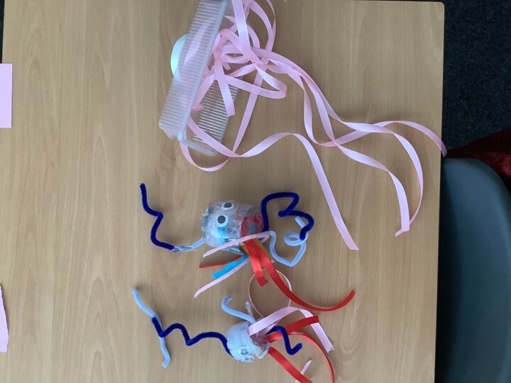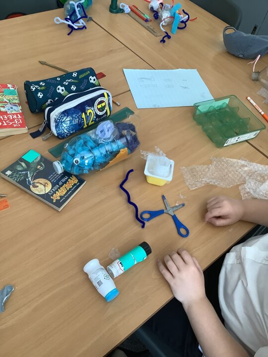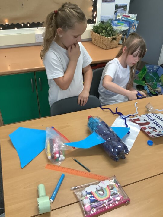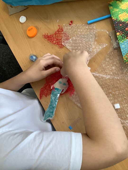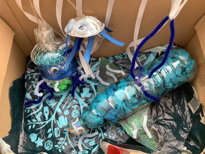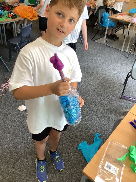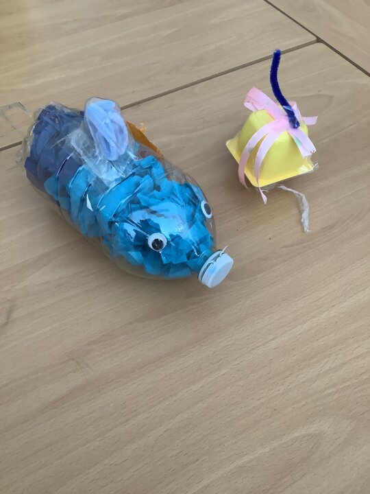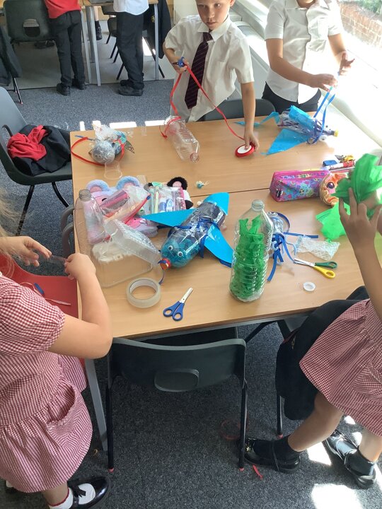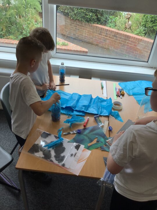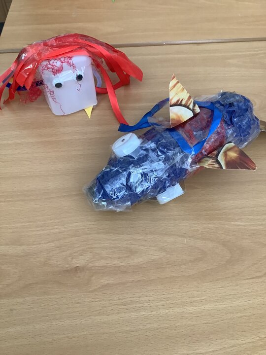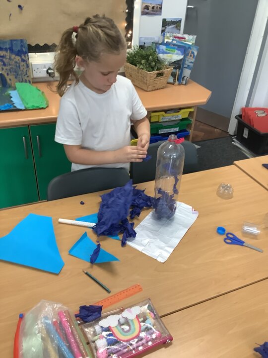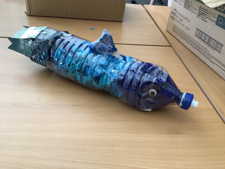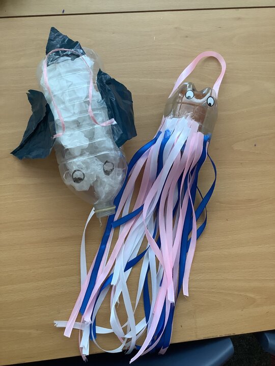 In art, we have been learning about sculpture. We learnt about two environmentalist artists called Judith and Richard Lang who create sculptures from plastic they find on a beach in California. We used as many recycled materials as possible to create our sculptures inspired by Judith and Richard Lang’s art.