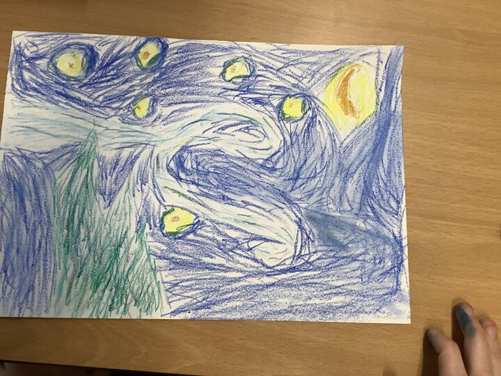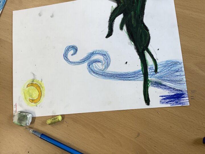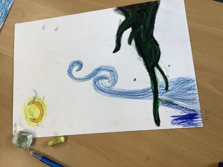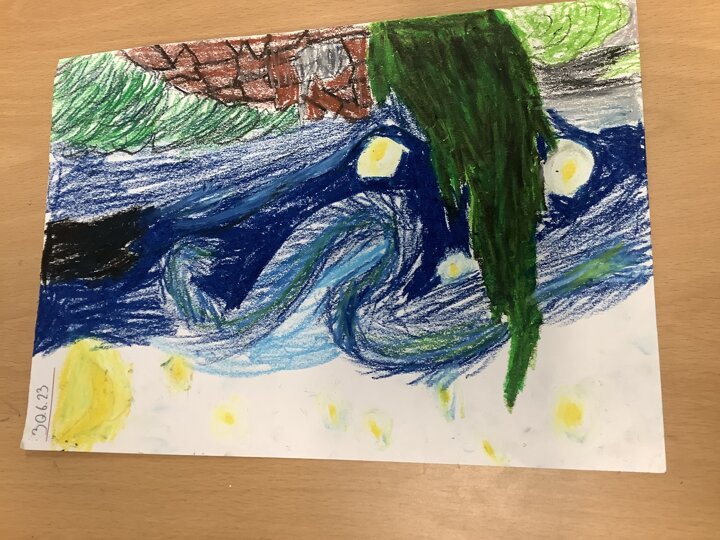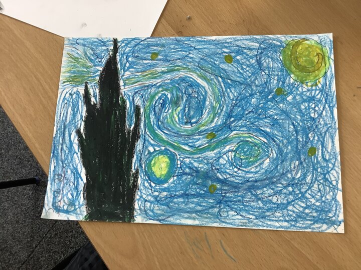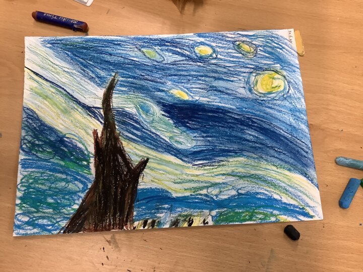 In Class 4 we having been creating oil pastel drawings of Van Gogh’s ‘Starry’ night.