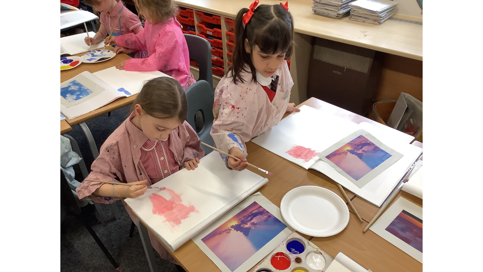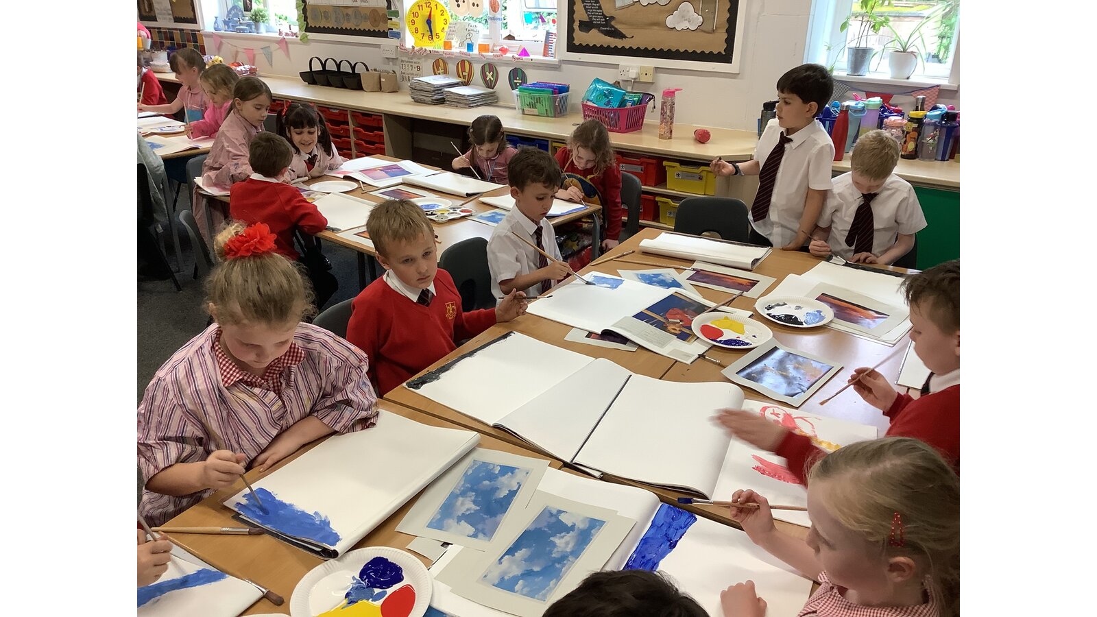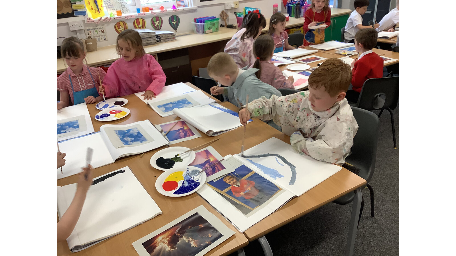 In art this half term we have been looking at painting. We have experimented with different brush strokes, we have mixed primary colours to make secondary colours, we have added white to make tints and black to make shades. We have also looked at the art work of William Turner. Today we combined all of our skills and created our final pieces which were pictures of the sky.