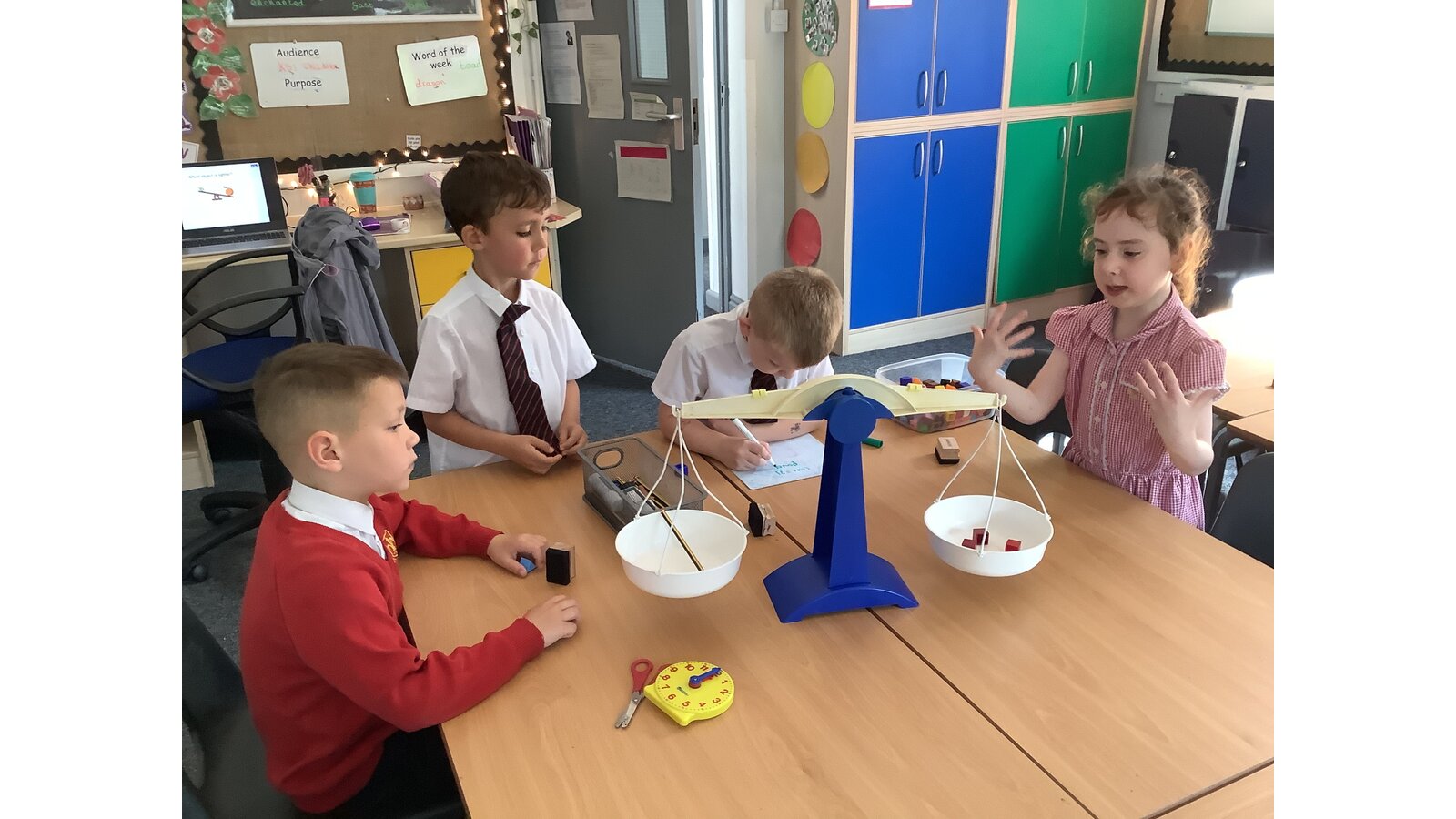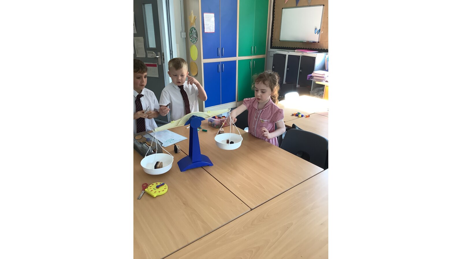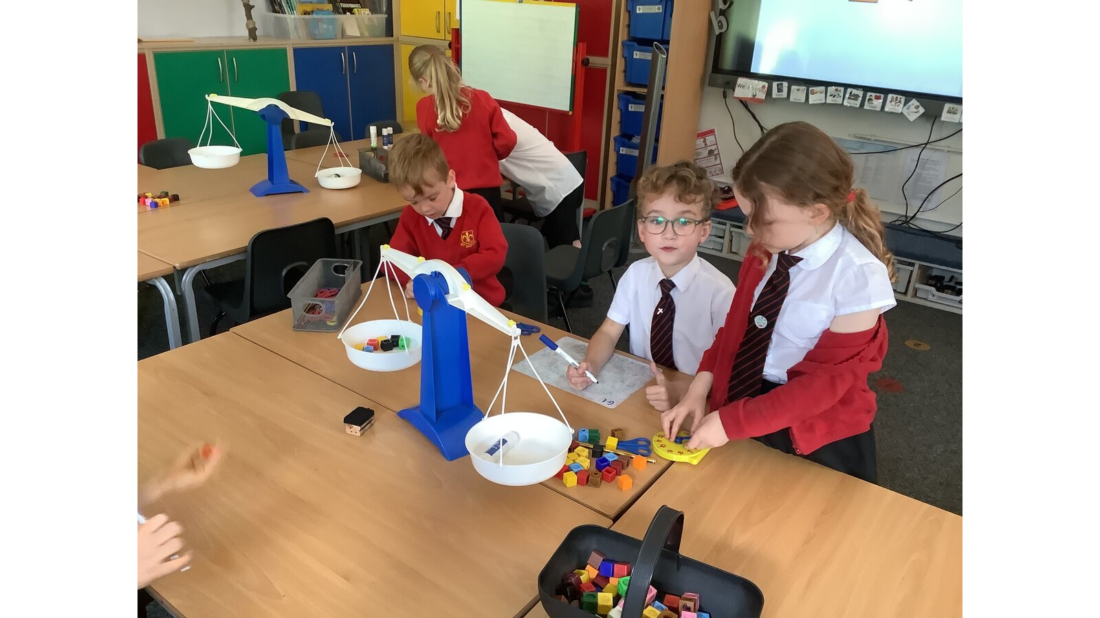 In maths today Year 1 have been using yer balance scales to compare the mass of classroom objects and work out mass using cubes. We used language such as heavier, lighter and balanced.